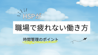 残業しない HSPが職場で疲れない働き方|仕事をスムーズに進める時間管理の工夫 HSPで仕事中に疲れやすい方に向けて、刺激に敏感な特性を活かしつつ、疲れない働き方を実現する時間管理の6つの工夫を紹介します。忙しい毎日でも無理なく仕事を進め、心身の負担を減らしたい方に役立つ具体的な方法が満載です。 2025.07.30 残業しない